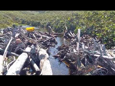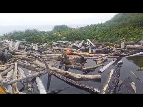 国後島のトロイノイ渓流。流木や漁具などで河口が塞がれサケの遡上が妨げられている。2023年初秋