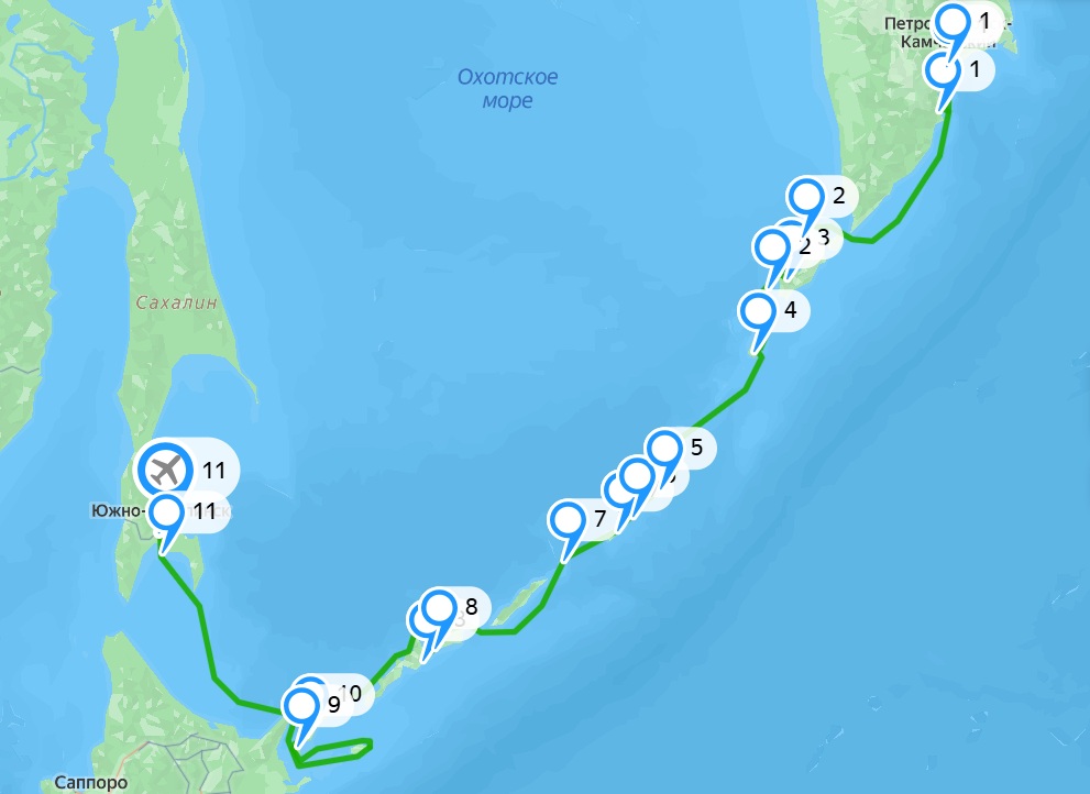 旅程は、カムチャツカ半島のペトロパブロフスク・カムチャツキーを出港し、千島列島最北端のアトラソフ島(阿頼度島)を経てオネコタン島(温禰古丹島)に上陸。クレニツィン火山(黒石山)へのトレッキング。パラムシル島(幌筵島)、千島列島の中部に位置するウシシル島(宇志知島)のヤンキチャ島(南島)、シムシル島(新知島)から千島最大の島である択捉島へ。海岸線に沿って28キロメートルにわたって広がる、珍しい形と色をした奇岩群「ホワイトロック」やバランスキー火山(指臼山)の温泉で入浴。続く国後島ではゴロブニン火山(泊山)のカルデラ、ストルプチャティ岬(材木岩)を訪れる。最終寄港地はサハリンのコルサコフ港。