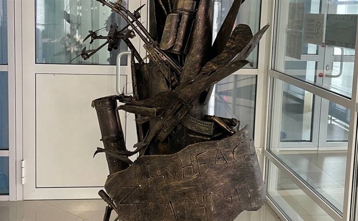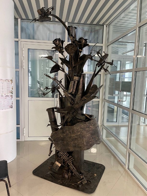 ウクライナでの特別軍事作戦中にドネツク人民共和国でサハリン出身のロシア兵が収集した鹵獲兵器の破片で作られたオブジェが択捉島クリリスク(紗那)のスポーツ文化会館で展示公開されている。