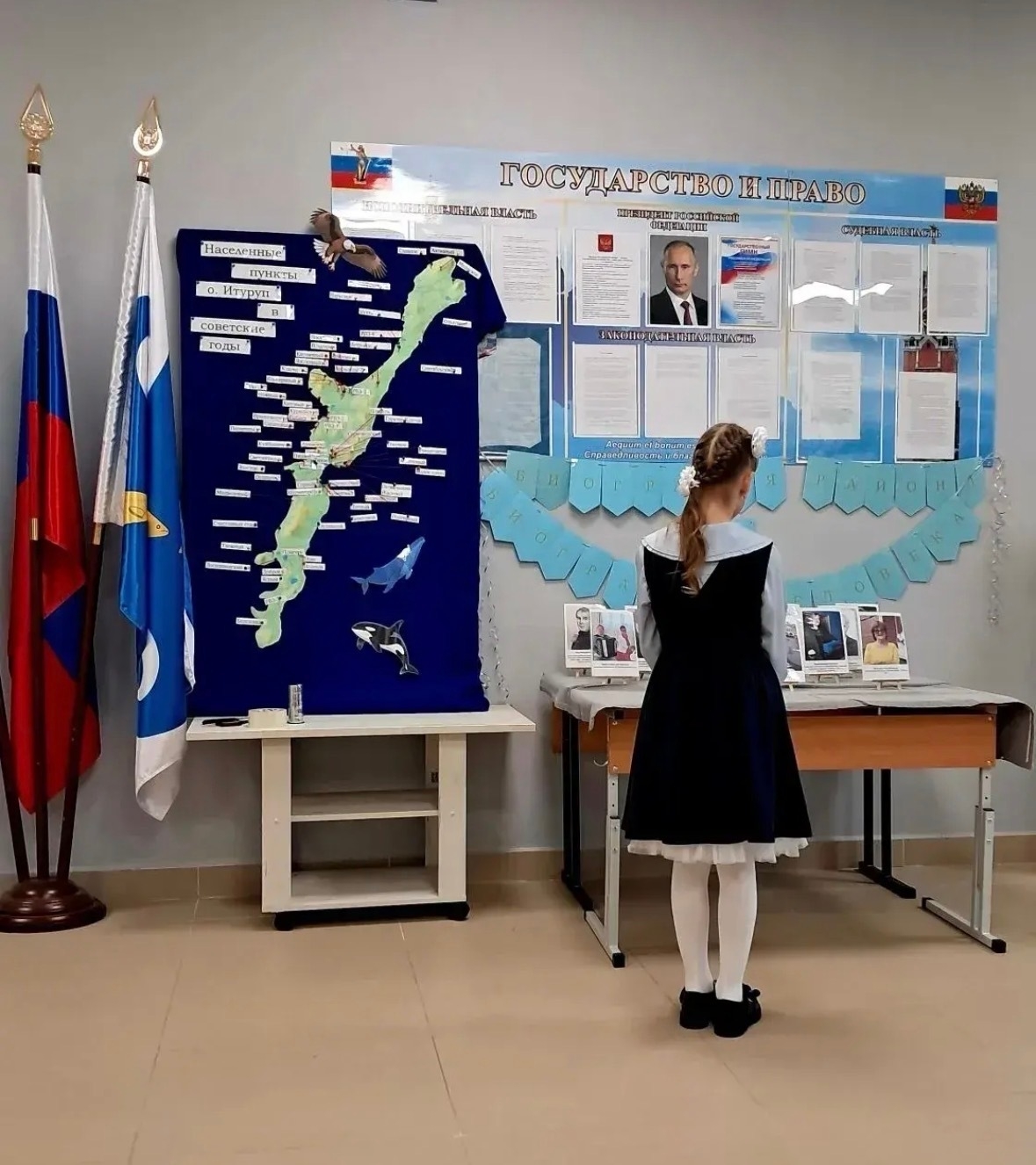 択捉島ブレベスニク(天寧)村の中等学校では、クリル地区設立80周年を記念する行事が行われている。教師と生徒たちは、ソ連時代の択捉島の地図を作成し、当時の島での生活を描いた写真展を開催した。写真展には、努力、才能、そして献身によって島の発展に消えることのない足跡を残した人々の肖像が並んだ。