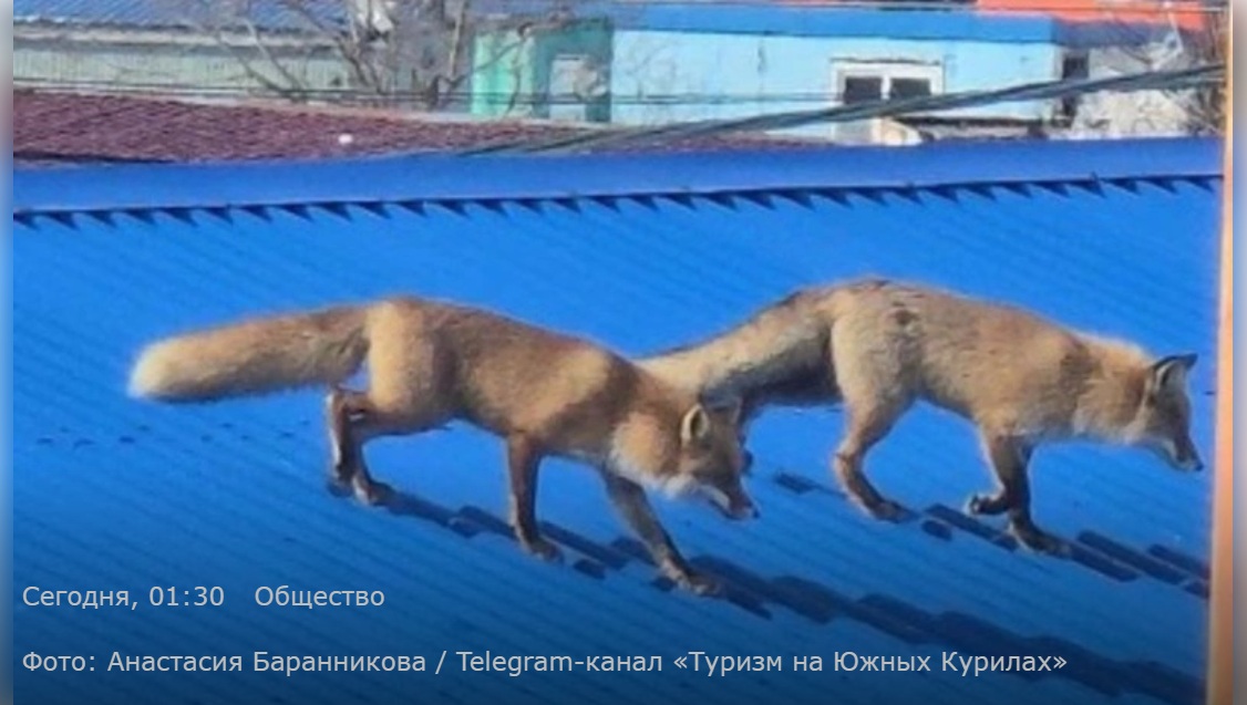 国後島ユジノクリリスク(古釜布)中心部のクリルスキー大通りにある建物の屋根で、キツネ2匹が目撃された。晴れた日にキツネたちが歩く様子を捉えた映像が、テレグラムチャンネル「南クリルの観光」で共有された。