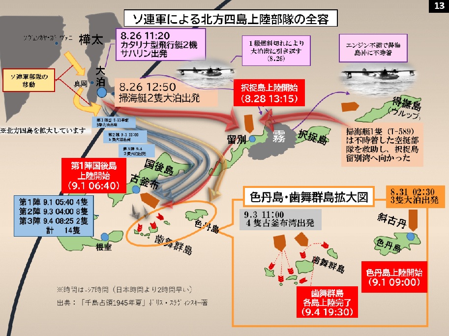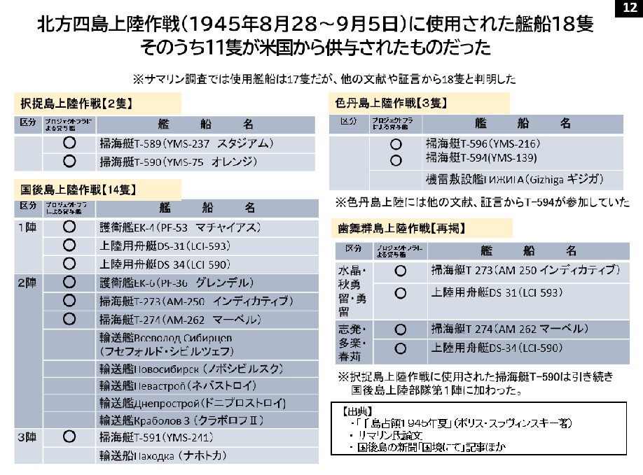 ソ連軍は1945年8月28日に択捉島、9月1日には国後島と色丹島に上陸し、歯舞群島を含めて9月5日までに北方四島を占領したが、この間、ソ連軍が上陸に使用した艦船18隻のうち11隻が米国から供与されたものだった。(脚注参照)