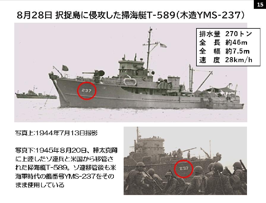 1945年8月28日、濃霧に包まれた択捉島・留別に突如姿を現したのは米海軍時代にYMS-237の艦番号を持っていた全長46mの木造掃海艇である。同年8月20日、ソ連軍が南樺太の真岡に上陸した時に、この船を写した写真が残っている。ソ連に移管されT-589としてソ連太平洋艦隊に登録されたが、艦番号は米海軍時代の237のままだった。塗り直す間も惜しんで対日戦争に投入されたものと考えられる。