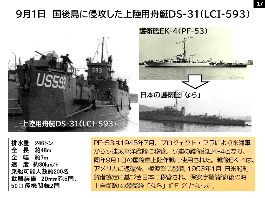 9月1日に国後島に侵攻した護衛艦EK-4は、米海軍のPF-53「マチャイアス」で、全長は約93mあった。戦後、EK-4は米国に返還され横須賀に配備された。1953年に日米船舶貸借協定に基づき日本に移管され、保安庁警備隊(後の海上自衛隊)の護衛艦「なら」となった。ソ連軍の国後島上陸に使用され、日本の領土を奪う作戦の一翼を担った艦船が、戦後は日本の領土を守る任務に就いたのだった。全く数奇な運命をたどった船であるが、ソ連と日本にこの船を供与したのが米国であるという事実はブラックジョークに近い。