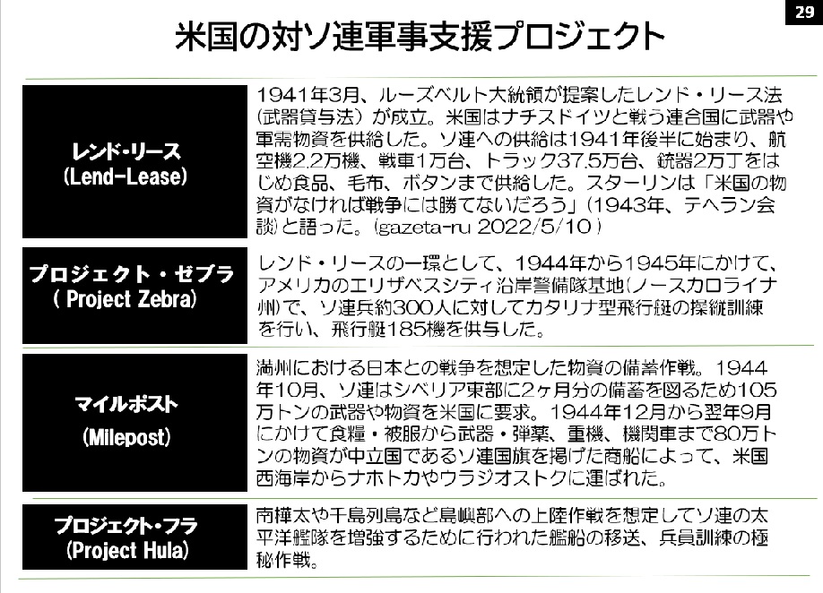 米国は自国の若者の犠牲を最小限に抑えて、戦争の早期終結を図るにはソ連の対日参戦が不可欠と考え、自ら掲げた領土不拡大の原則をあっさり反故にして、南樺太の返還と千島列島の引き渡しを密約しただけでなく、南樺太や千島列島に侵攻するための艦船を提供し、兵の訓練まで行っていた。