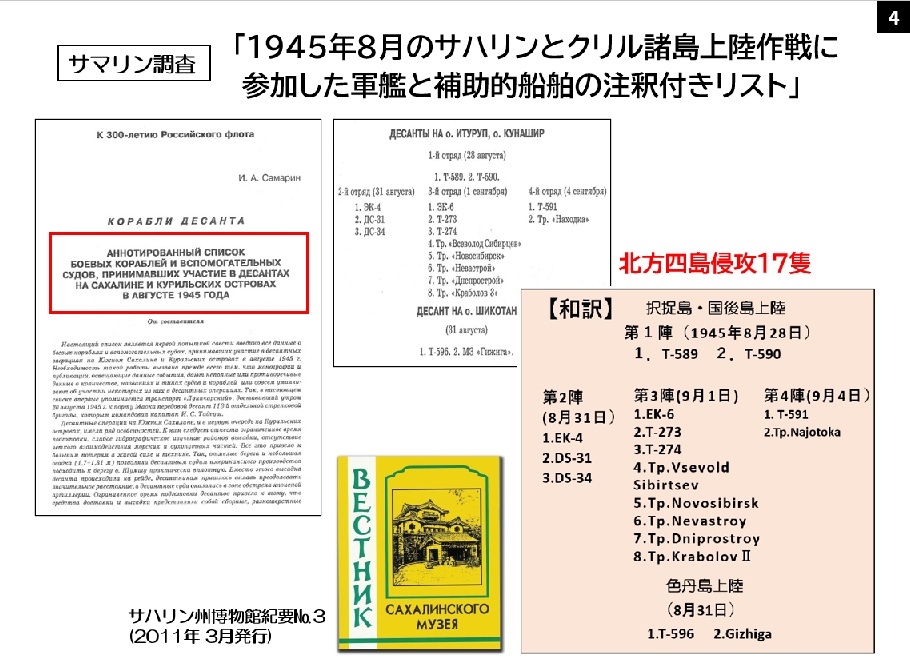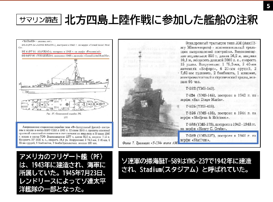「占守島の戦い」ではソ連側が撮った写真が残されているのに、なぜ北方四島上陸時の写真が1枚もないのだろうか–。調査はそんな疑問から始まった。手法はもっぱらインターネット検索で、サハリン州郷土博物館のホームページ内にある「博物館紀要」が引っかかった。表題は「1945年8月のサハリンとクリル諸島上陸作戦に参加した軍艦と補助的船舶の注釈付きリスト」とあり、北方四島上陸に使用された17隻の船の艦番号や諸元が記されていた。例えば、国後島上陸に使用さたれたソ連の護衛艦EK-4については「米国のフリゲート艦(PF)は1943年に建造され、1945年7月23日、レンドリースによってソ連太平洋艦隊の一部となった」と書かれていた。
