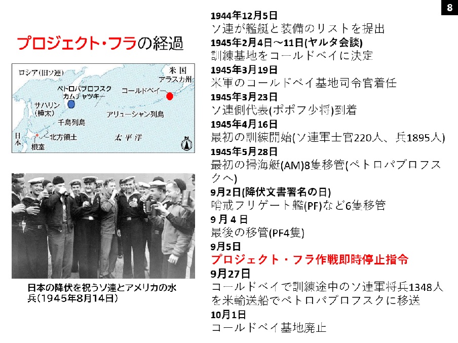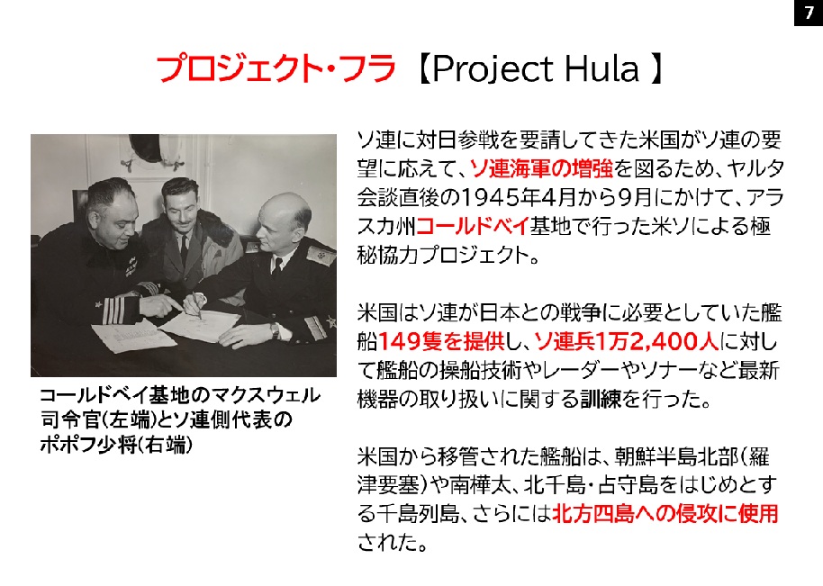 プロジェクト・フラは、米国の公文書ではフラ・ツー(HULA-TWO)とも表記される。日米開戦直後からソ連に対日参戦を促してきた米国がソ連の要望に応えて、ソ連海軍の増強を図るため、ヤルタ会談直後の1945年4月から9月にかけて、アラスカ州コールドベイ基地で行った米ソによる極秘協力プロジェクトである。米国は、ソ連が南樺太や千島列島の侵攻に必要としていた上陸用舟艇など艦船149隻を提供し、ソ連兵1万2,400人に対して艦船の操船技術やレーダー、ソナーなど最新機器の取り扱いに関する訓練を行っていた。米国から移管された艦船は、朝鮮半島北部や南樺太、北千島・占守島をはじめとする千島列島、さらには北方四島への侵攻に使用された。
