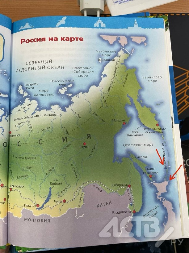 問題の書籍は、児童書と青少年向けの書籍を専門とするロシアの出版社「ロスマン」が発行する子供向け百科事典「私たちの故郷–ロシア」。その中に掲載されているロシアの地図には、北海道本島と国後島の間、択捉島の真ん中を分断するように点線が描かれていた。