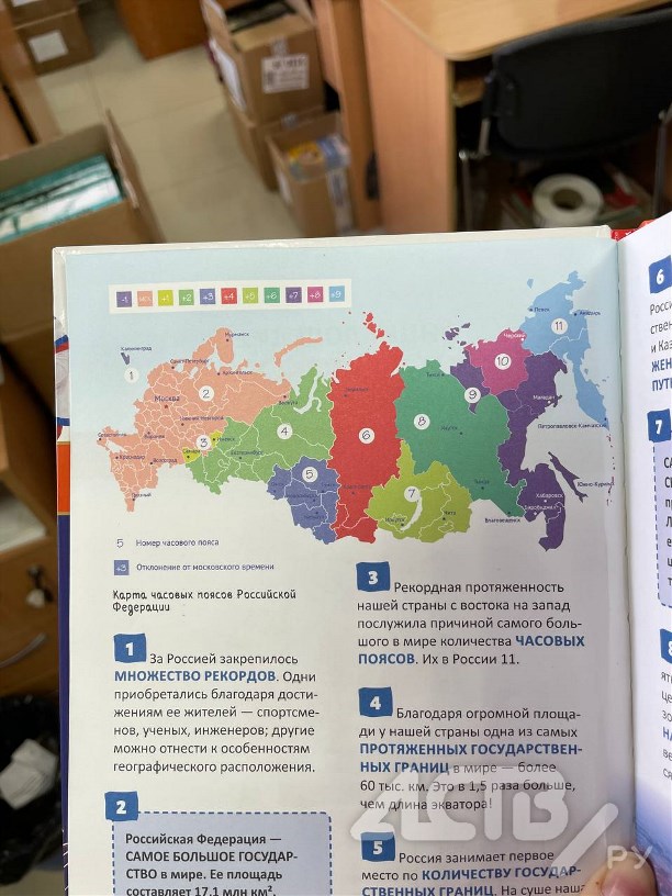 さらに、同じ出版社が発行する、児童向けの別の書籍『ロシアの記録』では、サハリン島は「モスクワ時間から+7時間」、クリル諸島は「+8時間」のタイムゾーンに設定されていた。(※ロシアでは、クリル諸島はサハリン島と同じタイムゾーンとされている)