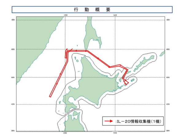 令和7年10月10日(金)午前から午後にかけて、ロシアの情報収集機(IL-20)×1機が、樺太方面から飛来し、日本海及びオホーツク海の上空を飛行した後、反転し、再び日本海から樺太方面へ飛行したことを確認した。これに対し、航空自衛隊の北部航空方面隊の戦闘機を緊急発進させ対応した。